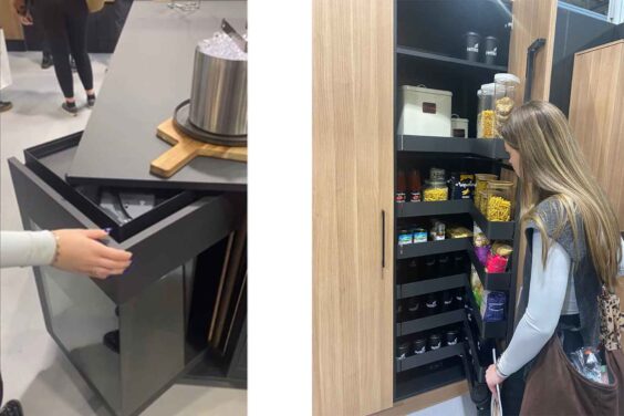Smart storage solutions are one of the most sought after elements of any kitchen space, or any living space at all for that matter! At kbb we were surprised by the newest innovations, such as the rotating corner cabinet that completely tucks away when not in use (pictured left). Smart and discrete storage solutions in tall cupboards were also nice to see as they boast practicality but keep the contents hidden.